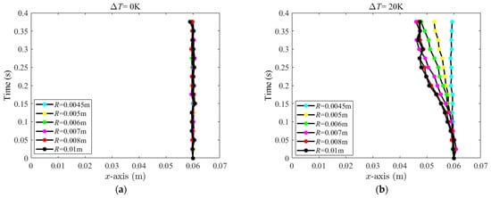 Figure 7a–f show the movement of the centroid position of the bubble in the x-direction with a radius from R = 0.0045–0.01 m under different temperature gradients, 0 K, 20 K, 40 K, 60 K, 80 K, and 100 K, respectively. It is found that the bubble stays at the center under the uniform temperature, as shown in Figure 7a. Once the temperature difference between the two walls increases, the vapor bubble starts to migrate slowly towards the hotter side, as shown in Figure 7b–d. Compared with the first group (R = 0.01 m to 0.05 m), it takes more time for smaller bubbles to reach the left wall. At a higher temperature gradient, 80–100 K, it is much easier for the bubble to arrive at the left wall in a shorter time, as shown in Figure 7e–f.