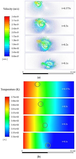Figure 8 shows the transient bubble centroid position in the -axis with varying bubble radius from 0.0045 m to 0.01 m. In Figure 8a, when the bubble radius R is 0.0045 m, the centroid position of the bubble does not move for the cases of = 0 and 20 K. With a larger > 40 K, the bubble moves faster. Figure 8b–f show that the vapor bubbles remain at the center in the x–direction when . Once the temperature difference between two walls increases, the bubbles start to move toward the left wall. It is shown in Figure 8 that the bubble with a larger size can reach the left wall faster than a smaller one. It is because the bubble with a larger size will encounter a larger temperature difference and hence higher surface thermal capillary force. Therefore, it reaches the left wall faster. Compared with the first group of larger bubbles (R = 0.01 m to 0.05 m), the bubbles with smaller radii remain spherical in shape for all sizes of bubbles from 0.0045 m to 0.01 m. Figure 9 shows the transient state bubble with radius R = 0.006 m and ΔT = 40 K at different time instants in (a) velocity field, (b) temperature field, and (c) pressure field.