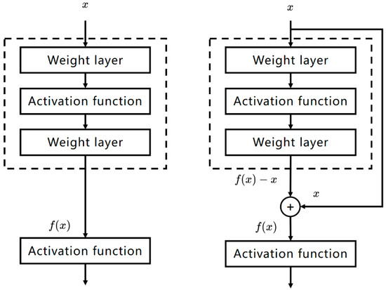 ResNet [30] is a residual CNN proposed by He et al. with the core idea of allowing the original input information to be passed directly to the subsequent network. The residual blocks [30] are designed based on the aforesaid concept, and the structure is shown in Figure 1. The innovative design allows the networks with residual blocks to be deeper with less possibility of gradient vanishing because the original input in the residual block can be propagated forward faster through the identity mapping.