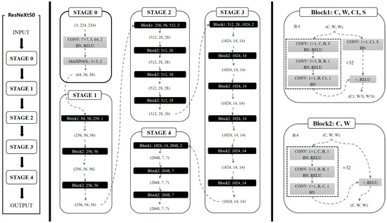 The ResNeXt-50 (32 × 4d) [31] model structure was adopted in this study. This structure is divided into six layers. The first layer consists of one initialized convolutional layer for preliminary feature extraction; the second layer consists of one maximum pooling layer and three ResNeXt residual blocks stacked for shallow feature extraction; the third to fifth layers consist of 4, 6, and 3 repeated stacked ResNeXt residual blocks, respectively, the size of which is reduced layer-by-layer for deep feature extraction; the sixth layer is used to calculate the full connection from the convolution layer features to the sample category mapping, and SoftMax is adopted to calculate the losses. The specific model structure is shown in Figure 3.