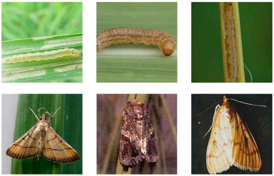 Sample of IP102 dataset images. Line 1 shows three different caterpillar species and Line 2 shows three different moth species; columns 1, 2 and 3 show the morphology of the same pest in different life cycles.
