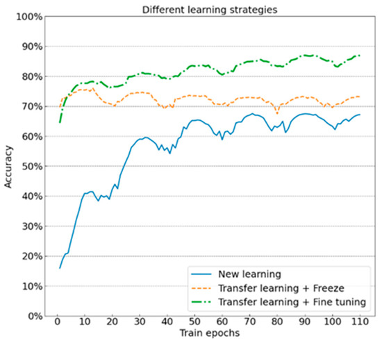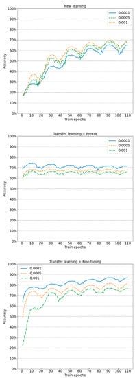 With the method of transfer learning, the model is close to the optimal solution at the initial moment of training since the model owns a certain pre-training “knowledge” in advance. The higher learning rate is prone to skip the optimal solution, resulting in low classification accuracy or severe fluctuations. When the combination of transfer learning + freezing is adopted, the part of feature extraction does not get involved in the learning, so it is less probably affected by the learning rate than the combination of transfer learning + fine-tuning. All groups of experiments with the learning rate of 0.0001 (experiment No.: 10 and 25) indicate good performance with accuracy of 86.95% after 110 periods of training. The results show that better training results can be achieved if the initial learning rate of the model with transfer learning is set to 0.5 or 0.1 times of the new learning.