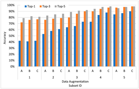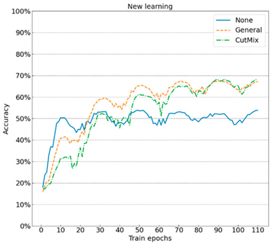 As shown in Figure 7, the selection of appropriate data augmentation can significantly improve the classification effect of the model. When the new learning is adopted, since the model needs to learn the “knowledge” from the target dataset which has a small capacity, it cannot fully meet the needs of model training. Therefore, the experimental results show obvious overfitting without the data augmentation. For example, in the third group of experiments, the training accuracy rate reaches 99.59%, but the accuracy is only 53.78%. After the data enhancement is adopted, the accuracy rate is greatly improved, and the overfitting is significantly reduced. As another example, in the sixth group of the experiment, the training and testing accuracies reach 85.73% and 67.16%, respectively. The adoption of base augmentation or CutMix augmentation has no significant influence on the results of new learning model. It is expected that the learning speed is slow due to the high complexity of CutMix enhancement in the early training process.