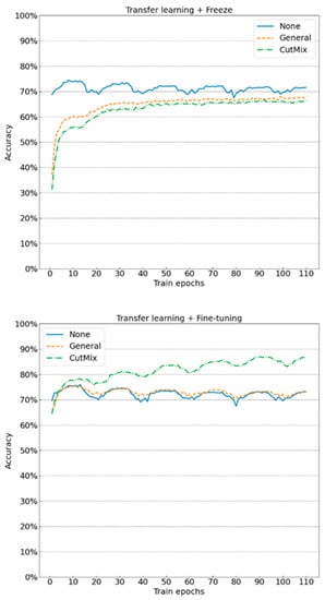 Freezing and fine-tuning have different options for data augmentation in terms of the experiments of transfer learning. When transfer learning + freezing is adopted, since the feature extraction does not get involved in the training, the data augmentation increases the possibility of misclassification of the fully connected layer, so the classification effect without data augmentation is the optimal solution. When transfer learning + fine-tuning is adopted, the feature extraction layer is pre-trained in similar datasets, and the basic data enhancement has no obvious influence on the experiment results. Taking the 19th and 22nd group experiments as the example, the accuracy rates are 72.64% and 73.86%, respectively. When more complicated data augmentation such as CutMix is adopted, it results in a better learning effect. As another example, in the 25th group of the experiment, the training and test accuracies reach 79.11% and 86.95%, respectively. Therefore, when the model has a certain “basic knowledge”, more complicated data augmentation helps the model learn at a further level.