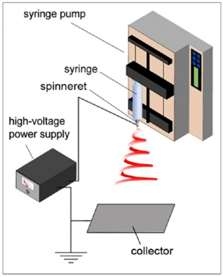 Schematic setup image for electrospinning method. Reprinted with permission from Reference [9]. Copyright 2017 American Chemical Society.