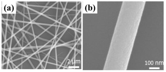SEM images of as-spun composite InTiO nanowires at different scales: (a) 2 μm, (b) 100 nm. Reprinted with permission from Reference [32]. Copyright 2019 IOP Publishing Ltd.
