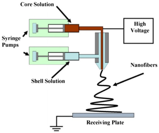 Schematic diagram of a set-up for coaxial electrospinning Reprinted with permission from Reference [36]. Copyright 2010 Elsevier B.V. All rights reserved.