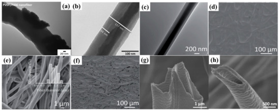 (a) TEM image of PVDF/PANi solid nanofibers. (b) TEM image of PVDF/PVDF-PANI core-shell nanofibers. Reprinted with permission from Reference [41]. Copyright 2013 Society of Plastics Engineers. (c) TEM image of a single PDMS/PVP fiber. (d) SEM image of PDMS/PVP fibers produced at room temperature. (e) SEM image of PDMS fibers collected with PVP component removed (the inset is the histogram of fiber diameter distribution), (f) SEM image of PDMS/PVP fibers collected at room temperature after removal of PVP. Reprinted with permission from Reference [42]. Copyright 2014 Royal Society of Chemistry; RSC Publishing. (g,h) SEM images of PVP hollow nanofibers produced by coaxial electrospinning and afterward treatments. Reprinted with permission from Reference [43]. Copyright 2019 WILEY-VCH Verlag GmbH & Co. KGaA, Weinheim.