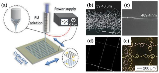 (a) Schematic setup image for near-field electrospinning to directly write fibers on a collecting board. Reprinted with permission from Reference [46]. Copyright 2021 Wiley-VCH GmbH. (b–d) SEM images of the PEO nanofibers were deposited on a silicon substrate when the collector moved at speeds of (b) 0.03 m/s, and (c) 0.36 m/s, respectively. Reprinted with permission from Reference [47]. Copyright 2010 IOP Publishing. (d) SEM image of PEO fibers deposited in a pattern by controlling the motion of the collector along with both X and Y directions during near-field electrospinning. Reprinted with permission from Reference [48]. Copyright 2011, American Chemical Society. (e) The latticed pattern of polystyrene nanofibers by near-field electrospinning. Reprinted with permission from Reference [49]. Copyright 2012 Elsevier Ltd.