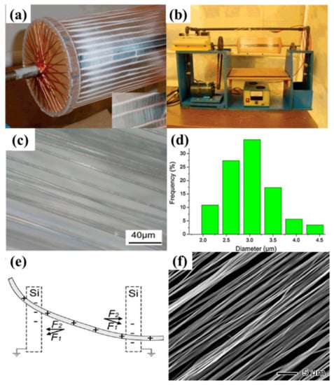 (a) Images of copper wires wrapped disks, where electrospun nanofibers are collected on the copper wires and the magnified inset image shows the aligned nanofiber. (b) Apparatus for rotating the copper wire drum during electrospinning. Reprinted with permission from Reference [50]. Copyright 2004 American Chemical Society. (c) Photograph and (d) histogram showing the size distribution of aligned PMMA fibers. Reprinted with permission from Reference [51]. Copyright 2014 Elsevier B.V. (e) Diagram of the electrostatic forces acted on a charged nanofiber traversing an insulating gap. The electrostatic force (F1) was produced by the electric field while the Coulomb interactions (F2) originated from the positive charges on the nanofibers and the negative charges on the two grounded electrodes. (f) SEM image of the uniaxially aligned PCL nanofibers. Reprinted with permission from Reference [52]. Copyright 2003 American Chemical Society.