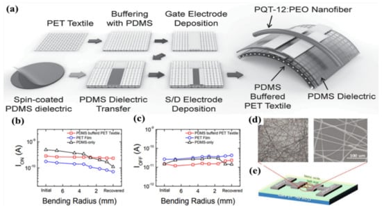 (a) The manufacturing process of PDMS-buffered PET textile-based transistors and comparison of the actual (b) On- and (c) Off-currents of the PQT-12:PEO nanofiber OFETs prepared on various types of substrates as a function of bending radius. Reprinted with permission from Reference [66]. Copyright 2016 WILEY-VCH Verlag GmbH & Co. KGaA, Weinheim. (d,e) Schematic structure of InZnO and HfInZnO nanofiber transistors and the SEM images of the electrospun nanofibers acting as the channel layer. Reprinted with permission from Reference [68]. Copyright 2019 The Korean Physical Society. (d) Optical microscope image and scanning electron microscopy (SEM) image of InZnO nanofibers mats. (e) Schematic illustration of the transistor.