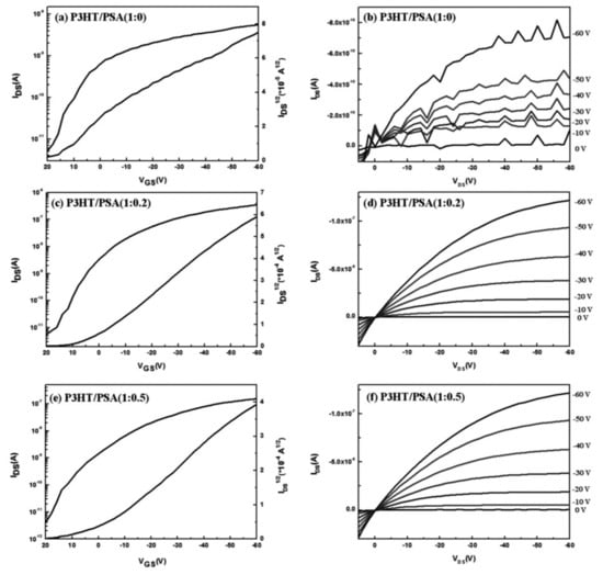 Transfer characteristics of nanofiber-based transistors at different blending ratio of P3HT/PSA. Reprinted with permission from Reference [69]. Copyright 2013 WILEY-VCH Verlag GmbH & Co. KGaA, Weinheim.
