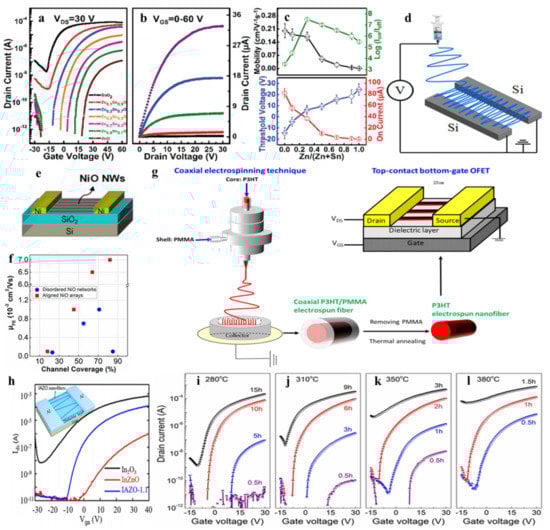 Besides the application of organic FET, metal oxide semiconducting nanofibers produced by electrospinning technology open up new possibilities for the fabrication of the field-effect transistor. In 2006, p-type CuO nanofiber was successfully made to further contribute to the transistor with a conductivity of 3 × 10−3 S/cm [67]. Two kinds of hybrid metal oxide materials (InZnO and HfInZnO) were adopted separately to achieve transistors with superior device performance, and their structures are shown in Figure 9e [68]. These transistors demonstrated negligible hysteresis, a decent electron mobility of 5.49 cm2 V−1 s−1, and a good on/off current ratio of 107.