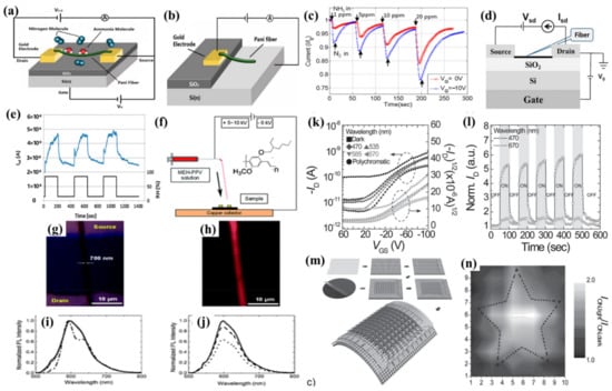 Applications of electrospun nanofiber-based transistors. (a–c) Structure and electrical characteristics of single PANI nanofiber field-effect transistor: (a,b) two different structures of the PANI nanofiber-based device. (c) The current response of the FET in real-time for various NH3 concentrations at VG = 0 V and VG = −10 V. Reprinted from Reference [80] Copyright 2011 MDPI. (d) A schematic illustration of the transistors based on GZO nanofibers and the according to electrical measurement circuits. (e) Source-drain current(Isd) of GZO FET as a function of time under exposure to 15% and 85% relative humidity. Reprinted with permission from Reference [81]. Copyright 2012 The Materials Research Society. (f–j): single nanofiber transistor based on MEH-PP and its photoluminescence properties: (f) Schematic layout of electrospinning process to fabricate single nanofiber-based FETs and the inset image shows the MEH-PPV molecular structure. (g) Bright-field and (h) fluorescence micrographs of a light-emitting single-fiber-based FET. (i) Normalized PL spectra of thin-film (dash-dotted line) and nanofiber embedded in a FET device with VDS = 0 V, and with VGS = 0 V (continuous line) or −40 V (circles). (j) Nanofiber PL spectra for VGS= 0 V (continuous line), −20 V (dashed line), and −40 V (dotted line). Reprinted with permission from Reference [82]. Copyright 2010 Royal Society of Chemistry. (k–n) Textile-based OFETs with PQT-12:PEO nanofibers with excellent photosensitivity: (k) Transfer characteristics of PDMS buffered textile-based phototransistors under light illumination with various wavelengths. (l) Real-time photoresponse behaviors under the illumination of monochromatic light with a wavelength of 470 nm (blue) and 670 nm (red). (m) Schematic depiction of the manufacturing process of photoimaging arrays (10 × 10) of the PDMS-buffered textile-based photosensors. (n) Spatial photo-sensing mapping of the textile-based photosensor matrix under light illumination with the star-shaped laser source. Reprinted with permission from Reference [66]. Copyright 2016 WILEY-VCH Verlag GmbH & Co. KGaA, Weinheim.