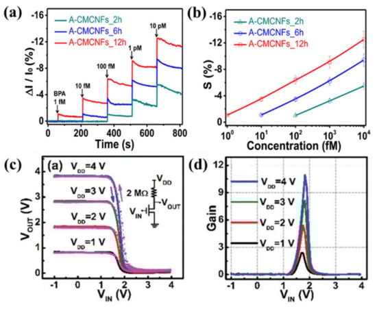 Besides the form capability of sensing, electrospun nanofiber-based FETs can act as chemical sensors. For instance, at an unprecedentedly low concentration of 1 fM of the Bisphenol A(BPA), a field-effect transistor sensor using aptamer-modified multichannel carbon nanofibers (MCNFs) to detect the chemical showed remarkable sensitivity and specificity for BPA [83] (Figure 14a,b). It was also proven that an MCNFs FET sensor responds directly in seconds when exposed to BPA. Furthermore, typical and simple logic circuits are realized by electrospun nanofiber-based transistors, and their fundamental application of building blocks for hardware circuit implementation to execute complicated computation offers these kinds of transistors great opportunities to truly reform the future integrated circuits. For instance, FETs based on ZnSnO nanofiber mat were connected in series with a 2 MΩ external resistor to create a resistor-loaded inverter [13]. Voltage transfer characteristic (VTC) and a sharp inverter response with a maximum gain (defined as −∂VOUT/∂VIN) of 11 at VDD = 4 V are shown in Figure 14c,d. This transistor had a good noise tolerance ability and wonderful dynamic behavior of the inverter under an ac square wave signal. Subsequently, transistors with different electrospun nanofibers, such as InGdO, Sr-doped In2O3, Al, Ga, Cr doped In2O3, and IGZO, were put into the resistor-loaded inverter circuit with different operating voltage and gain.
