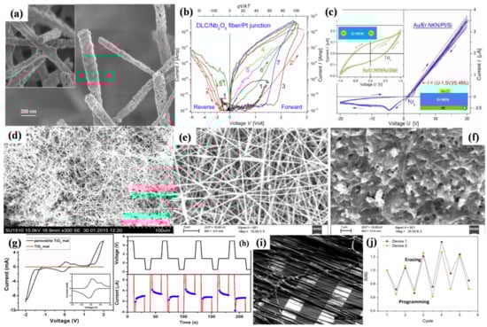 Memory materials or devices involving the electrospun nanofiber and their characteristics. (a,b) morphology of Nb2O5 fiber and its corresponding memory device: (a) SEM images of Nb2O5 nanofibers annealed at 700 °C for 1 h in air and the insert shows the nanofibers with higher magnification. (b) I–V characteristics of DLC/Nb2O5 nanofiber/Pt junction recorded in a constant voltage mode with a 100 kΩ ballast resistor. Reprinted with permission from Reference [107]. Copyright 2013 AIP Publishing. (c,d) electrospun Er:NKN nanofiber mat and its resistance switching characteristic: (c) I–V characteristics of the vertical Au/NKN(260μm)/Pt/Si device and the inset image shows the I–V characteristics at low voltages in the planar Au/NKN(350μm)/Au cell on Sitall substrate. (d) SEM images of as-spun Er:NKN fibers. Reprinted from Reference [108] Copyright 2017 IOP publishing. (e–h) perovskite decorated electrospun TiO2 nanofibers and according memory applications: SEM image showing the morphology of (e) PVA-TiO2 mat and (f) perovskite decorated PVA-TiO2 mat. (g) I–V characteristics of both pristine PVA-TiO2 mat and perovskite decorated PVA-TiO2 mat. The inset box shows the enlarged region of numerous Negative Differential Resistance (NDR). (h) The switching performance of perovskite decorated TiO2 mat during a continuous “write–read–erase–read” sequence. The voltage pulse is depicted in black and the current response is depicted in red. Reprinted with permission from Reference [109]. Copyright 2020 Springer-Verlag GmbH Germany, part of Springer Nature. (i) Electron microscopy images of PCL-C60/MWCNT fibers showing parallel electrospun fibers onto interdigitated electrodes after the thermal treatment. (j) electrical resistance variation of PCL-C60/MWCNT fibers-based memory devices under electrical programming and thermal erasing cycles. Reprinted with permission from Reference [110]. Copyright 2020 Elsevier Ltd.