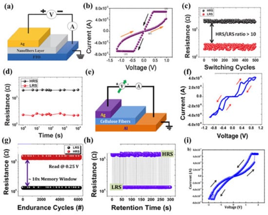Interest in one of the types of electronic memory devices, resistive memory devices, has increased markedly during the last few years. The most striking feature of this kind of device is the hysteresis loop in the current–voltage plane, which cannot be duplicated by other three-layer circuit elements, and the device resistance can be reversibly changed by an applied voltage while being maintained in its absence. It is well-known fact that the abrupt transition between two resistive switching states is caused by the formation and breaking of the conductive filament of the active layer. Initially, the device is in the high resistance state (HRS), with very little current flowing through it. The top electrode is biased while the bottom electrode is grounded during the electrical measurements. In this case, metal atoms from the top electrode are ionized and drift towards the bottom electrode with a positive voltage given to the top electrode. When the magnitude of the applied voltage (VSET) reaches a certain level of value, a conductive filament made up of ions originating from the top electrode forms a bridge between the top and bottom electrodes, allowing current to flow freely through the device, and the resistance of the device drops, leading to the low resistance state (LRS). The negative bias mode exhibits a similar pattern of behavior concerning electrochemical breakage of the conductive filament and the corresponding state-changing voltage is termed as the RESET voltage [111]. In 2020, Aditya A. Patil et al. innovatively came up with a memory device based on 1D functionalized multi-walled carbon nanotubes (f-MWCNTs)-TiO2 composite electrospun nanofibers [112]. The device structure can be seen in Figure 16a. This three-layer random-access memory (RAM) showed obvious bipolar resistive switching (RS) behavior with clear evidence of the hysteresis loop (Figure 16b). The composite nanofiber-based device had excellent endurance and memory retention qualities, as demonstrated in Figure 16c,d respectively, which suggested that this memory device could easily toggle between LRS and HRS 500 times and could also keep these two states until 104 s without any significant degradation. Among other kinds of organic fibers, cellulose fibers with biodegradability, biocompatibility, and high tensile strength provided good charge transport pathways as well as support for the formation of the conductive filament of the bipolar resistive switching operation [113]. The “Sandwich” structure of Ag/cellulose fibers/Al memory device (Figure 16e) was then fabricated using the electrospinning technique and worked on low resistive switching voltage (±1 V) instead of an additional electroforming step (Figure 16f). It also had excellent endurance for 6 × 103 resistive switching cycles with a 10× memory window and great data retention capability for the 3 × 102 s without any observable degradation in the resistance states (Figure 16g,h). Moreover, cellulose–gelatine micro composite fibers (CGMFs) were fully used to realize the organic resistive switching devices and they are different from the previous ones in that test results proved that they had a pretty large current (~4 mA) when the RAM was in the LRS due to the formation of the conductive filament and the low resistance value of the CGMFs composite at SET voltage [114] (Figure 16i). These exploratory studies present the fact that cellulose fiber-based memristive devices represent a sensible option for the organic non-volatile memory application.