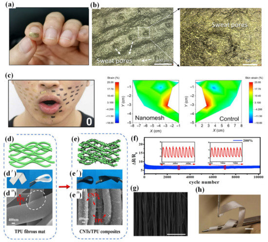 Sensing application for electrospinning methods. (a–c) Flexible/stretchable strain sensors from electrospun nanofibers: (a) Picture of nanomesh sensor attached to a fingerprint. (b) Micrographs of nanomeshes on the surface of artificial skin and distinct sweat pores are revealed. (c) Facial strain monitoring during the speech. The nanomesh-attached face (right side) exhibits skin strain mapping comparable to that of a face (left side) without nanomeshes. Reprinted with permission from Reference [117]. Copyright 2020 American Association for the Advancement of Science. (d–f) Illustration of the preparation process of aligned CNTs/TPU mats and CNTs/TPU strain sensor with superior performance: (d) Illustration of the pure aligned TPU fibrous network, (d′) Depiction of a pure TPU mat, and (d″) SEM image of pure TPU fibers, the white circle represents a joint between two TPU fibers. (e) Illustration of CNTs/aligned TPU fibrous network, (e′) Depiction, and (e″) SEM image of the CNTs/TPU strain sensor. (f) The sensing performance of the strain sensor in 10,000 stretching-releasing cycles towards a strain from 0 to 200% and the insets represent the sensing behaviors in 3000–3010 and 7000–7010 cycles. Reprinted with permission from Reference [118]. Copyright 2018 Elsevier B.V. (g,h) Piezoelectric sensors based on electrospun P(VDF-TrFE) with excellent flexibility: (g) SEM image of aligned nanofibers (scale bar, 10 μm). (h) Picture of highly aligned piezoelectric fibers with free-standing condition (scale bar, 1 cm). Reprinted with permission from Reference [123]. Copyright 2013, Nature Publishing Group, a division of Macmillan Publishers Limited.