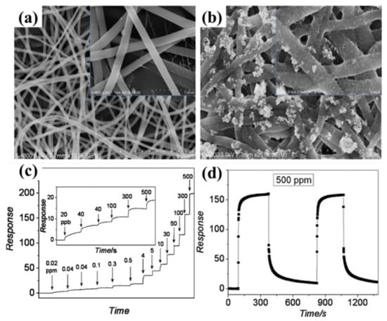 SEM image of (a) MWNTs–PA6 composite nanofibers and (b) MWNTs–PA6–PPy electrode and the inset shows the partial surface morphology of the fibers. Reprinted with permission from Reference [124]. Copyright 2012 Elsevier B.V. (c,d) Conducting polymer-based gas sensors and the device response to gas: (c) Increase in gas response of SPEEK/PPy nanofibers in a progressive manner with a successive injection of NH3 into the test chamber. The inset shows the response in the range of 20–500 ppb. (d) Response/recovery curves for SPEEK/PPy nanofibers at NH3 concentrations of 500 ppm at room temperature. Reprinted with permission from Reference [125]. Copyright 2012 American Chemical Society.