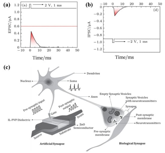 Schematic diagram of the excitatory postsynaptic current and the inhibitory postsynaptic current for different presynaptic impulses. (a) EPSC (b) IPSC. Reprinted with permission from Reference [126]. Copyright 2021 Chinese Physical Society. (c) Comparability between biological synapses and artificial synaptic transistors. Reprinted with permission from Reference [127]. Copyright 2017 WILEY-VCH Verlag GmbH & Co. KGaA, Weinheim.