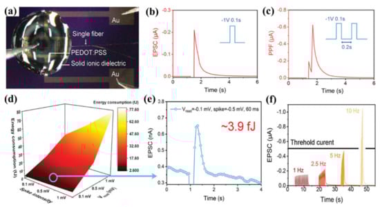 Solid-ion gated OFETs with PEO/PQT12 nanofiber channel and its electrical properties: (a) Image of practical structure of the FET. (b) Typical ESPC behavior of the transistors triggered by a presynaptic spike (−1 V, 0.1 s). (c) Typical PPF behavior of the transistors triggered by a presynaptic spike (−1 V, 0.1 s on, 0.2 s off). (d) Exploration of the energy consumption of the transistors at varied spike intensities and read voltages. (e) The lowest-energy EPSC behavior of the device is triggered by −0.5 mV and recorded by −0.1 mV and the minimum energy consumption is about 3.9 fJ. (f) EPSC signals in response to ten presynaptic pulses of different frequencies. Reprinted with permission from Reference [128]. Copyright 2020 WILEY-VCH Verlag GmbH & Co. KGaA, Weinheim.