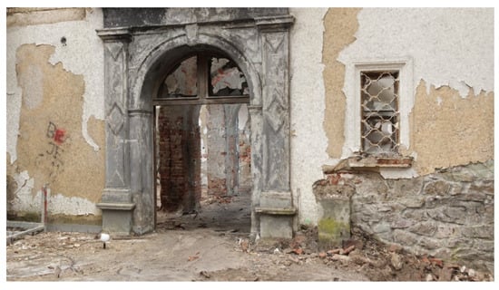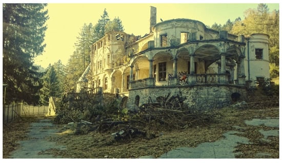 The Kunerad Mansion National Cultural Monument was chosen for the case study and impact and benefit assessment. The castle was built in 1914 by Count Valentín Balestrém (1860–1920). The construction was inspired by the Art Nouveau architecture style of castles. During the Slovak National Uprising in 1944, it served as headquarters for the Second Partisan Staff of Milan Rastislav Štefánik. It was burned down on 25 September 1944. After the end of World War II, it was confiscated and became the property of the state forests department. Subsequently, in the years 1945–1948, it underwent extensive reconstruction according to the project of Dipl. Acad. Arch. Ferdinand Čapek and became a medical institute for the treatment of respiratory diseases. In 1959, the manor became part of the Rajecké Teplice spa. On 25 May 1967, it was declared a national cultural monument together with the adjoining park. During the repair of the roof on 11 March 2010, the manor house was engulfed in a large fire. Since then, it has remained closed and dilapidated. On 20 October 2018, eight years after the devastating fire, the dilapidated mansion burned down again (Figure 1) [].