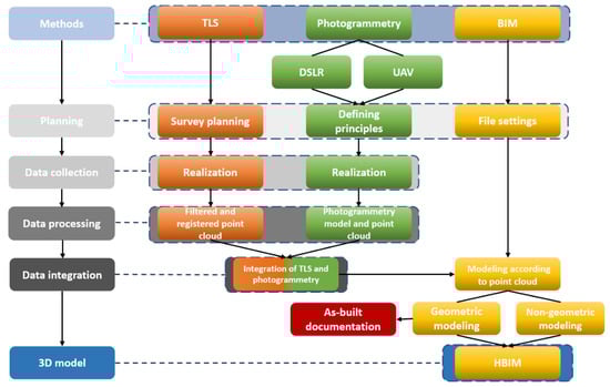 The used methodology is divided into 5 phases: planning, data collection, data processing, data integration and 3D model construction. Three methods were used within the methodology: TLS, photogrammetry and BIM. Each of the defined methods was included in the individual phases of the methodology according to the implemented project research. Some phases also interacted, while the as-built documentation was created from a geometric model. The scheme of the methodology is shown in Figure 2.