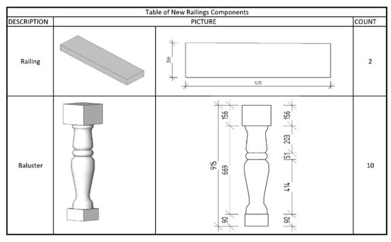 Within the creation of the HBIM model, it was also possible to complete the phase that represented the reconstructed state of some parts of the manor. As the example, we present a reconstructed baluster in Figure 14, while Figure 15 shows parts of the baluster with dimensions and numbers of pieces. This information was also used for the investor and other professions involved in the reconstruction.