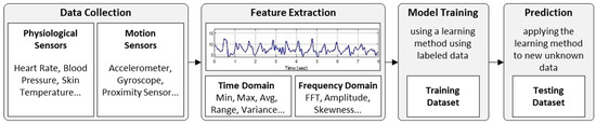 The recent development of wearable sensor-based human activity recognition (HAR) can provide an opportunity to address the current limitations of environmental barrier identification. The HAR technology has generally been formulated [29]. As shown in Figure 1, the general data-processing flow for HAR consists of (1) collecting the activity-related data from wearable sensors during performing activities, (2) extracting relevant features that can describe the sensed information, (3) using a learning method using labeled data, and (4) applying the learning method to new unknown data for HAR [29,30].