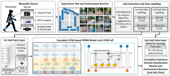 Figure 2 illustrates the research framework. The framework proposed in this study is mainly composed of four parts. The first part is data collection using a wearable device from participants (i.e., a chest-mounted camcorder for collecting ground truth, a pocket held smartphone for tracking the participant’s location using a global positioning system (GPS), and an ankle attached IMU sensor for securing 3-degree of acceleration and angular velocity respectively). Second, the experimenter attaches the equipment and walks along the set path at the test site, and the attached equipment collects data in this process. The data collection process in this study can be divided into two main categories. In the author’s previous study, 101,607 gaits were collected from 64 participants on the same site. The previously collected data is used to train and test the cascaded LSTM-based DRNN model. In addition, to check whether the cascaded LSTM-based DRNN model constructed in this study is feasible even for new data, 31,142 gaits collected through other subjects in the same experiment were collected. All data collected were obtained from O’Connor et al. After classifying them into individual gaits through the gait detection algorithm proposed by O’Connor et al. [50], they were labeled as normal gaits and abnormal gaits according to the ground truth and gait pattern. The third part determines the number of hidden layers by inputting the gait data collected in the previous study into the cascaded LSTM-based DRNN model. The data collected in the previous study are processed by dividing it into training data (80%) and test data (20%) through random sampling. The last part performs activity classification on the proposed model by using the newly collected data in this study as test data and finally confirms the relationship between the classification results and the environmental barrier. In the following sections, the details of each part will be elaborated on.