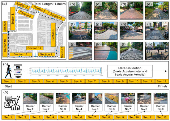 Graphical summary of experimental site and procedure; (a) site and sections; (b–m) representative pictures of each section; (n) first stage of experiment (data collection); and (o) second stage of experiment (examination and record of environmental barrier expressed by participants).