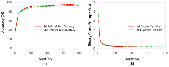 Accuracy and cost of testing using the first and second dataset: (a) accuracy (red line for the first data set and green line for the second dataset); and (b) binary cross-entropy cost between ground truth and predicted labels for test (red line for the first data set and green line for the second dataset).