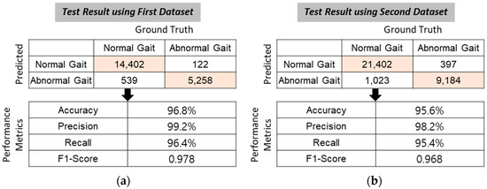 The test results and performance metrics: (a) gait classification results and performance metrics of the test results of the first dataset; and (b) gait classification results and performance metrics of the test results of the second dataset.