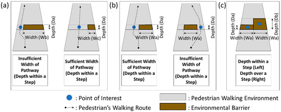 Figure 9b compares the location of an environmental barrier of the same size. Even an environmental barrier of the same size can affect the gait depending on the location. A sufficient walking path can be secured if the environment barrier is located on one side (Figure 9b left). As a result, the rate of abnormal gait can be measured relatively low. On the other hand, a relatively high rate of abnormal gaits may appear when the environment barrier is located in the middle of the pedestrian path and insufficient width of the gait on both sides is secured (Figure 9b right).