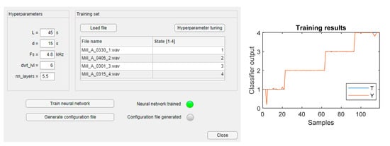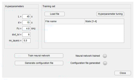 The main feature of the IoT system proposed in this paper is ability to operate on a wide range of rotary machines. Therefore, the hyperparameters from Figure 3 need to be adjusted for each machine separately. In addition, NN must be trained for each machine as well. In order to help the end user with configuration for a specific machine, we developed a separate software application using Matlab 2018a Application Designer, and whose execution flow is given in Figure 4. The main window of this configuration software application is shown in Figure 5. Hyperparameter configuration can be manually entered in the upper left side of the window while audio signals for NN training can be loaded on the upper right side. There is an option for users to activate the hyperparameter tuning algorithm, or to select manually entered hyperparameters. Then, the neural network can be trained, and the configuration file can be generated by pressing appropriate buttons. This configuration file should be loaded into the proposed IoT system.