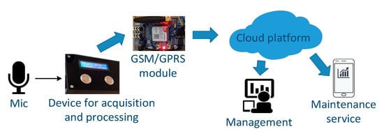 The system we present in this paper is designed to autonomously perform an estimation of the state of the rotary machine and provide the result in a convenient way to the various stakeholders. The schematic diagram of this system is shown in Figure 7. A microphone, connected to a microprocessor platform for acquisition and processing, captures the acoustic signal produced by a rotary machine. After the recording of the acoustic signal sample is completed, its processing is performed (as explained in the previous section) in order to estimate the condition of the observed machine. The obtained result is delivered to the users.