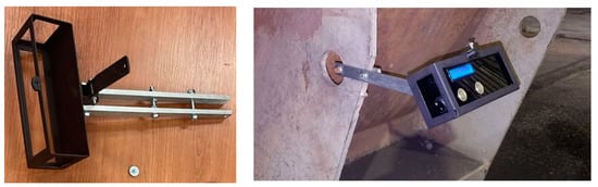 The device (the mentioned components) is packed in a plastic box, 3D printed of high-quality plastic, resistant to the high temperatures. Initially, it was planned to mount the device on the rotary machine using strong magnets. However, after the experience in the initial design phase, we gave up on such a solution because it turned out that we would have huge problems with the temperature and vibrations that produce rotary machines in an industrial surrounding. Therefore, we decided to mount the device on the machine using the bracket made of metal construction (Figure 9, left), which is fixed to the construction of the machine by the screws (Figure 9, right). Using a rod of appropriate length, which is mounted on the body of the bracket, the microphone approaches very close to the surface of the machine, while the device itself is far enough to avoid the heat impact to the body of the box and electronic components inside.