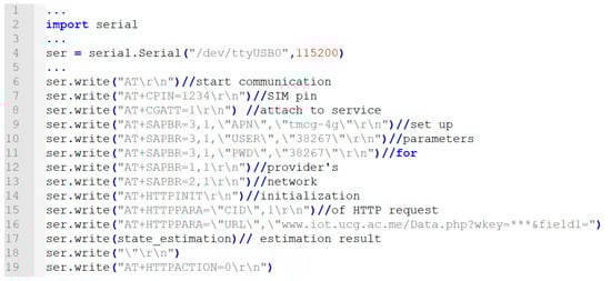 Using the USB port makes it much easier to establish communication with the GPRS module. The programmer just needs to include the serial library in the Python code (line 2 in Figure 10). After that, the communication with the corresponding device has to be opened and the communication speed is set. Then, the corresponding AT commands in the form of strings are sent to the module via a set of “write” commands.