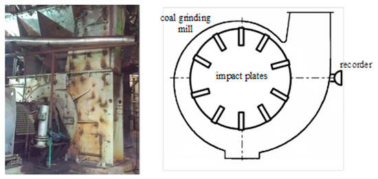 Installation of acquisition device: bracket for device accommodation (left); device mounted on the industrial coal mill (right).