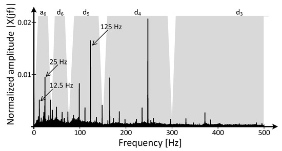 Frequency characteristics of the recorded signal. Gray areas represent the frequency bandwidth of the corresponding DWT coefficients: , , , and lower frequency parts of .