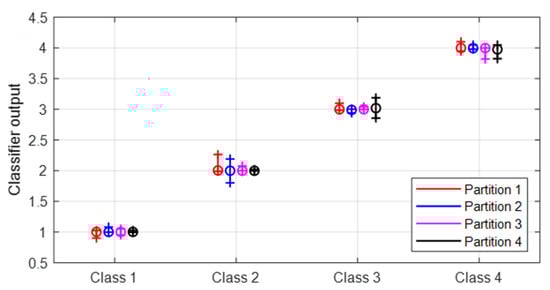 It is important to verify that the classification procedure is able to correctly generalize the results and that the high accuracy achieved in this example is not accidental. For that reason, the training and testing of the neural network was repeated in order to validate the behavior of the algorithm. All the data from the previous example (the total of 933 samples) was again randomly divided into training (70%) and testing (30%) sets and this partitioning was conducted four times, simulating a form of cross-validation verification. The results are presented using boxplot visualization in Figure 14, where each train-test partitioning is shown in different color. For each class, classification results are presented with median value (denoted with circles) and 25th and 75th percentile (denoted with horizontal lines). It is evident that high classification accuracy is achieved with all data partitions which shows that overfitting has not occurred and the algorithm performs properly.