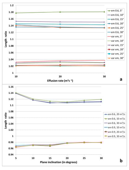Length ratio of the lava flows simulated with a constant emissivity of 0.6 and 0.9 vs. variable emissivity, by varying the effusion rate (a) and the inclination of the plane used as DSM (b).