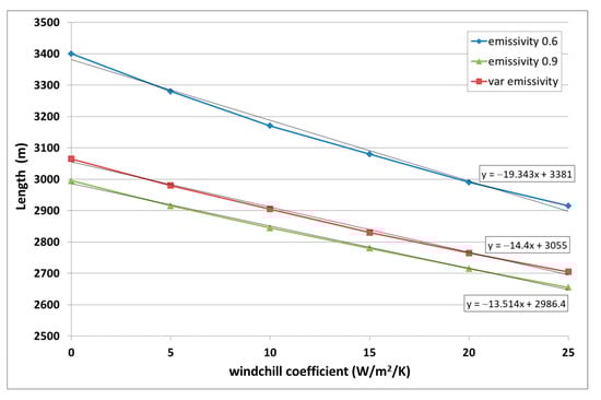 Trend of the maximum lengths of the lava flows simulated on a 20-degrees inclined plane using different windchill coefficients (from 0 to 25). Results were also obtained using a constant emissivity of 0.6 and 0.9 and a variable emissivity. The three downward trends were approximated by linear functions with slopes of about −14 (for 0.9 and variable emissivity) and −19 (for 0.6 emissivity).