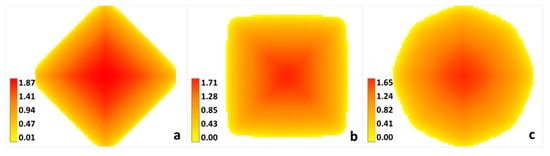Figure 3 shows the final emplacements for different values of the diagonal correction factor. With factor 0, the flow only happens between cells in the east/west and north/south directions (Von Neumann neighborhood), resulting in the classical diamond shape. With factor 1, the flow also happens in the diagonal direction (Moore neighborhood), and the resulting emplacement preserves a square-like shape even at longer times. By contrast, the ideal coefficient value of 2−6 results in a nearly perfectly circular emplacement.