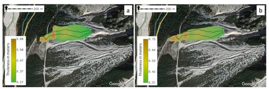 GPUFLOW simulations of the 2006 debris flow in the Dolomites without (a) and with (b) the bias correction. Colors represent the deposit thickness in meters. The actual debris field was redrawn from [].