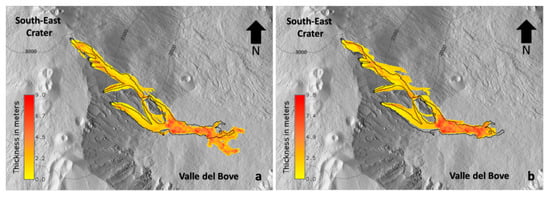 GPUFLOW simulations for the 24–27 December 2018 eruption of the Etna volcano. Lava flows were simulated using the temperature-dependent emissivity without (a) and with (b) the bias correction. Colors represent the lava flow thickness in meters. The actual lava flow field extracted by the Planetscope image (area of ~1 km2) and the five emission points along the eruptive fissure is highlighted in black. The outline of the actual field was determined by adaptive local thresholding using the free and open-source GRASS GIS software.