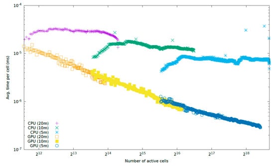 There were minor differences in the numerical results between the CPU and GPU execution due to different degrees of accuracy of the transcendental functions, which result in slightly different numbers of active cells and enveloping region. Therefore, rather than directly comparing the full simulation runtimes, we compared the average time needed for a full iteration for a single cell, by sampling the runtime of a full iteration and dividing by the number of cells in the active region.