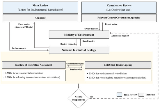 Various living modified organisms (LMOs) have been developed owing to advances in modern biotechnology, but there is concern about their potential risks to human health and the environment [1]. As a result, the Cartagena Protocol on Biosafety (CPB) to the Convention on Biological Diversity has developed an international standard for the use of LMOs [2,3,4,5,6]. Therefore, the Transboundary Movement, Etc. of LMOs Act (hereafter, the LMOs Act) was enacted in South Korea [7]. In particular, the Ministry of Environment (MOE) is in charge of the overall development and use of LMOs for environmental remediation [8,9,10,11]. The MOE is also responsible for the risk review and assessment of LMOs for other uses in natural ecosystems and LMOs for environmental remediation. The National Institute of Ecology (NIE), an LMO risk review agency and institute for LMO risk assessment under the MOE, has been handed responsibility for LMO safety management. The NIE establishes standards and methods for reviewing and assessing the risk of LMOs for environmental remediation. Furthermore, it consults on the effects of new LMOs on the natural ecosystem [10,11,12].