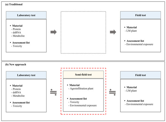 The approach proposed by the EPA for conducting LMO risk assessment for target organisms is based on the traditional steps, namely laboratory assessment (toxicity assessment) and field trials (exposure assessment) (Figure 2a) [23]. Among laboratory-based risk assessment methods, the artificial feeding bioassay is one of the most common approaches used for toxicity assessment; it uses a recombinant LMO protein diluted to the correct concentration and pipetted onto the surface of a solidified artificial diet [29,30,31]. Its advantages are that it provides rapid and easy application and uses significantly less LMO protein [29]. However, with artificial diets, there are disadvantages in that there can be an uneven distribution of LMO protein on the artificial diet surface, leading to non-uniform treatment and the inconsistent exposure of larvae [30]. Another major drawback of artificial diets is the instability of LMO proteins in artificial diets [30]. On the other hand, field trials have the advantage of using LMOs directly to evaluate putative ecological risks in the food chain. Furthermore, field trials have been used to collect a vast amount of otherwise anonymous information on how LMOs affect environmental changes in the field and natural ecosystems [31]. Nevertheless, there are three reasons for this lack of consideration in domestic field trials. (1) The disadvantage of field testing is that it is time-consuming and costly [8,18]. (2) Human resources and legal forces are inadequate to strictly manage all the confined fields for LMO risk assessment [7,18,32]. (3) There is a lack of long-term field trial data for LMOs that modify the domestic state; therefore, it is difficult to set the isolation distance [33]. Eventually, an approved LMO cannot be guaranteed upon adventitious release into the domestic environment.