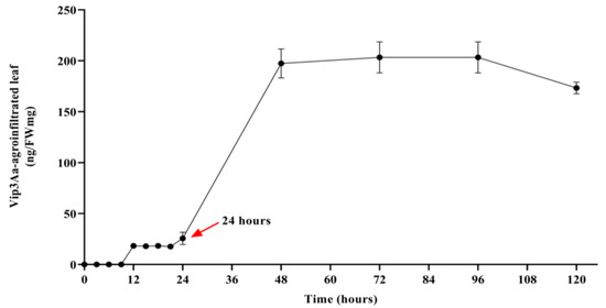 The expression level of Vip3Aa protein in the agroinfiltrated tobacco leaves. The red arrow indicates the starting point of Vip3Aa expression.